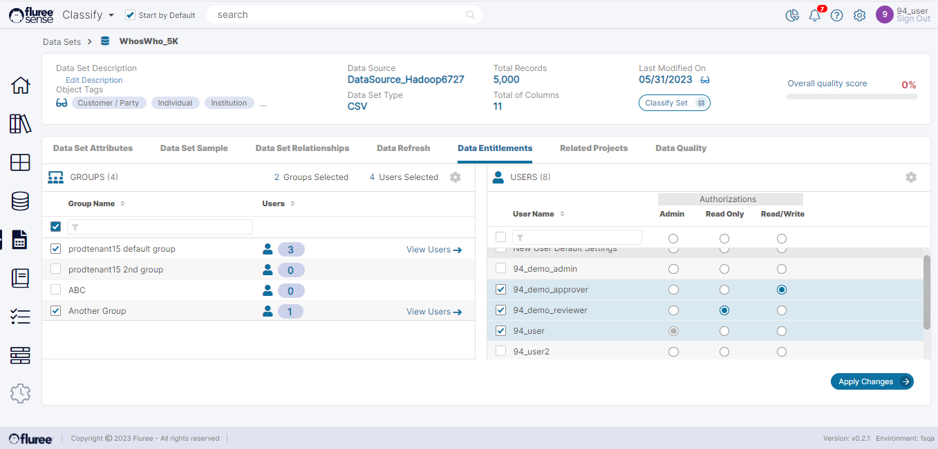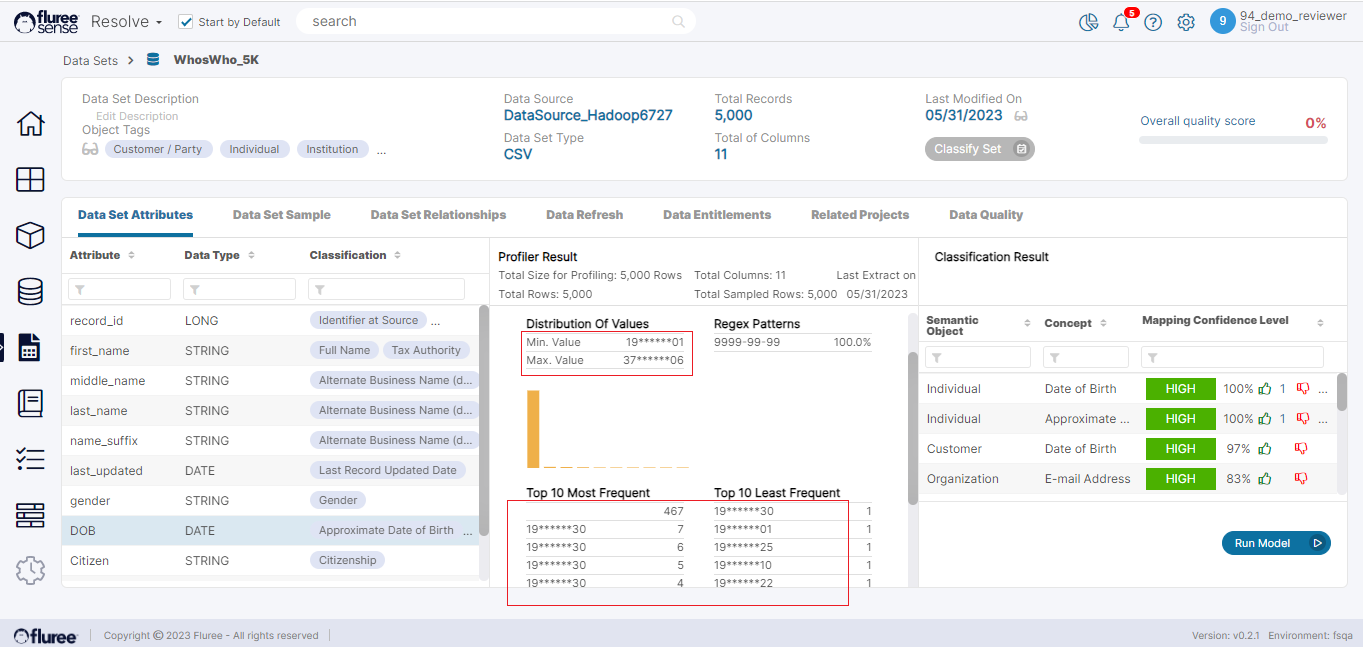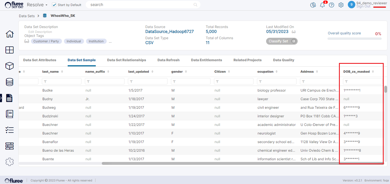 As we can see, the 94_demo_reviewer is having a Read Only entitlement here. Below is how the Data Set sample will look for this user for the DOB column. As you can see the value for DOB_zs_masked is not complete and is masked.