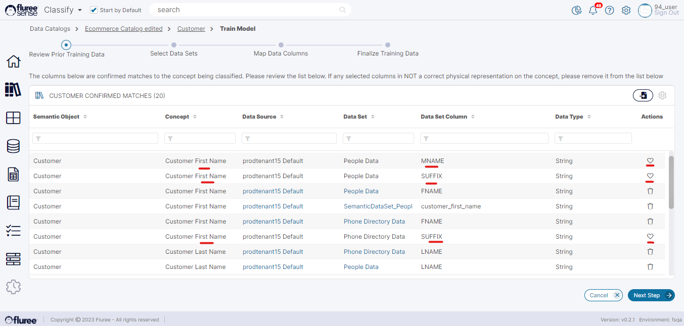 In the image below, as a practical example, see the red-marked concepts and the corresponding Data Set Columns. Since the items in each of the red-marked concept-column pairs don’t fit with each other, we clicked on the trash icon. Once clicked, the trash icon turns to the heart icon.