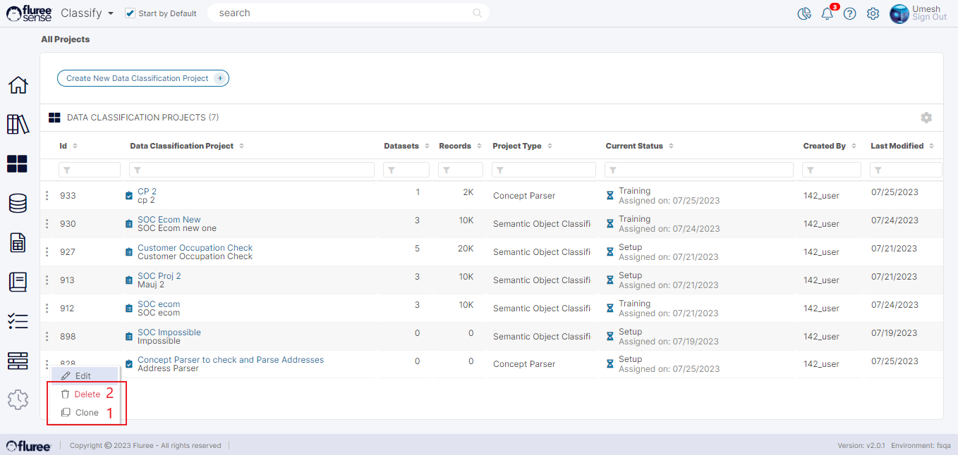 Cloning a Classification project will replicate all the input Data of the Project i.e. - the users, the Training and Project Data Sets etc. However, it will keep the name of the Project unique by changing the name as follows.