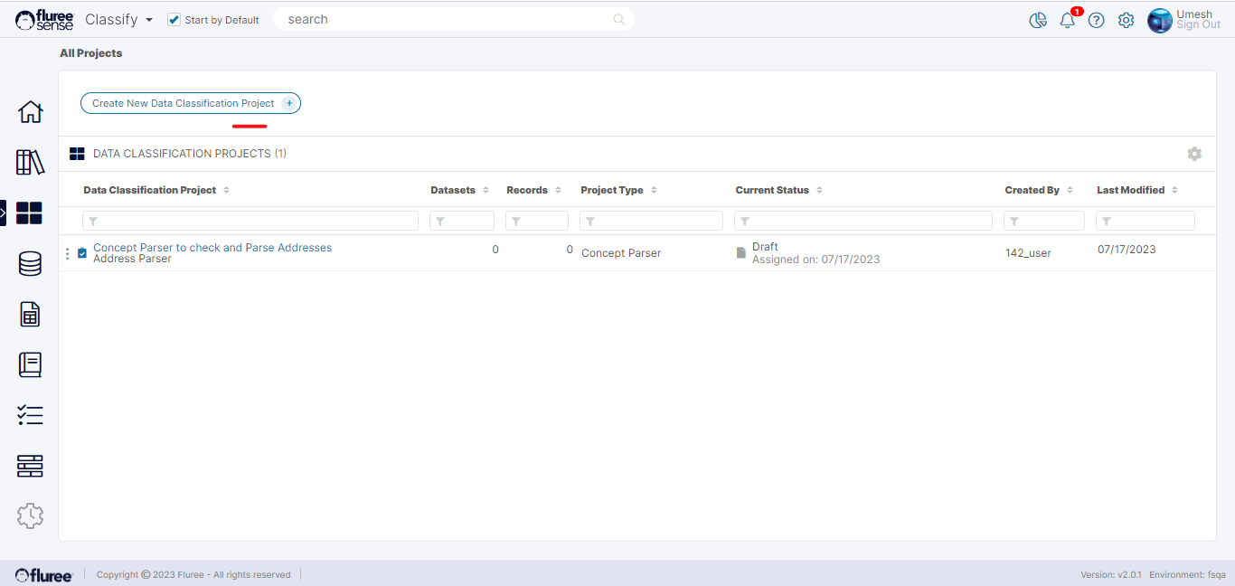 From the ‘All Project’ listing screen, the user needs to start the flow by clicking on the ‘Create New Data Classification Project’ button.