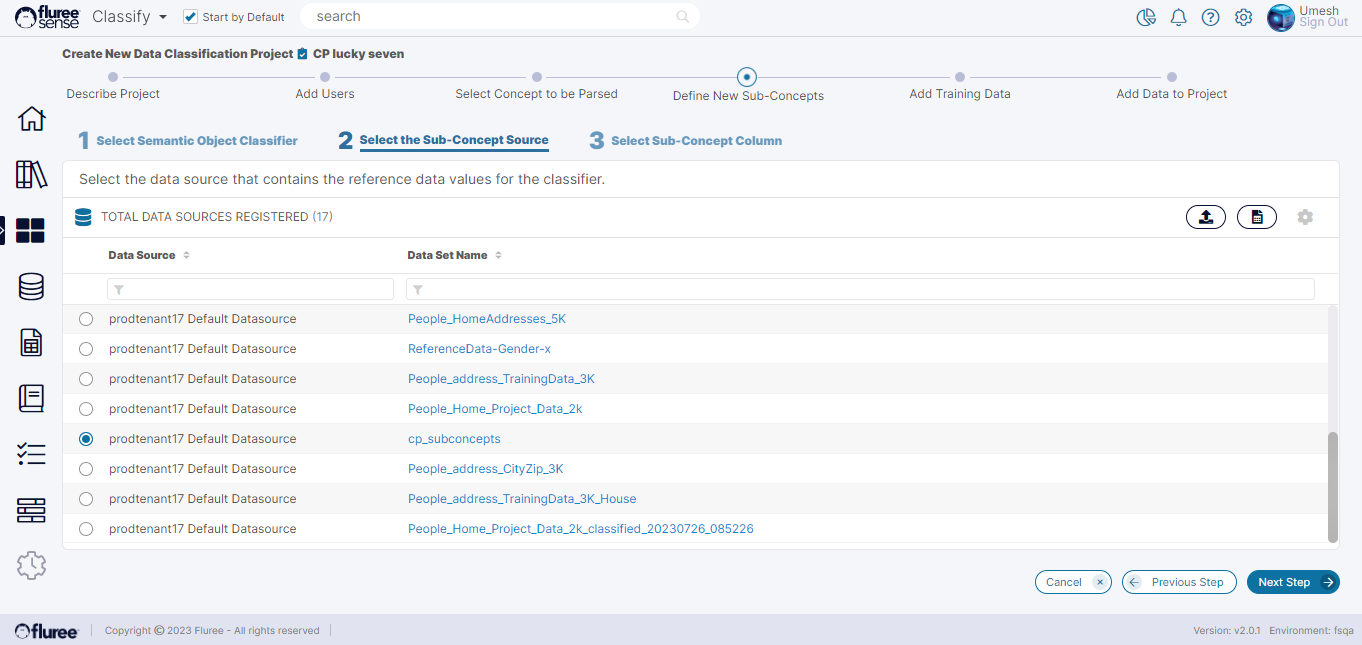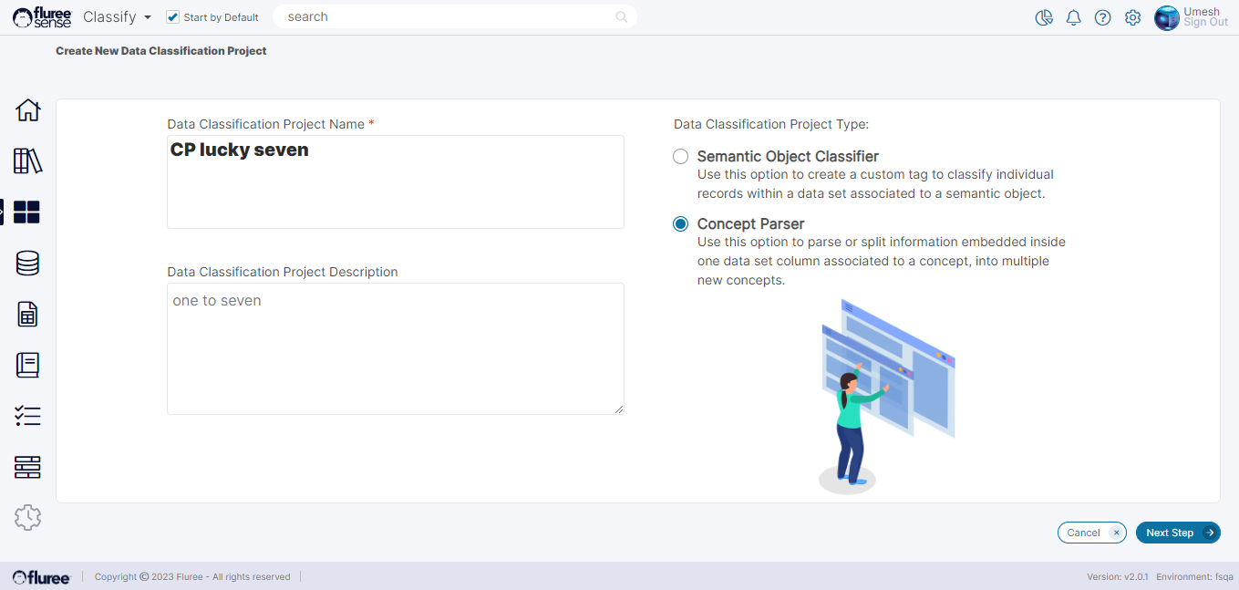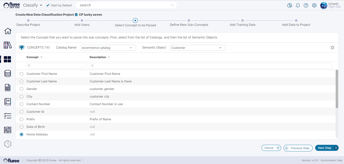 In this step, the user must first select a Catalog, then- one child Semantic Object and finally, one Concept from the list of Concepts which is to be parsed into Sub-Concepts. Then the ‘Next Step’ is to be pressed once the selection is made.