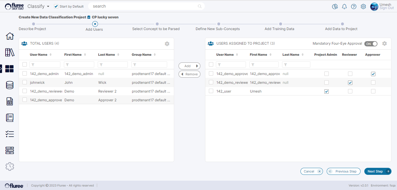 This step is also the same as in Semantic Object Classification Project flow. The logged-on user will be treated as the default Admin and can add Reviewer(s) and Approver(s) as per the Four Eyes check. Once the entitlements have been added, press the ‘Next Step’ button.
