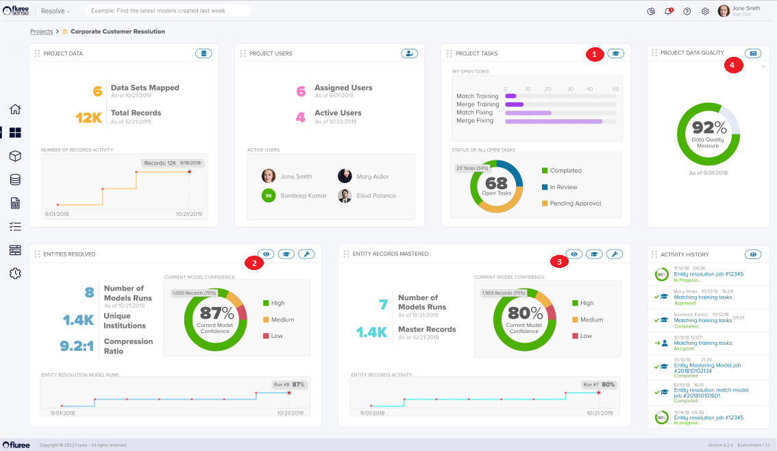 2. Entities Resolved: The results of the Entity Resolution (matching) model are displayed here. Here, one can view the confidence score stats, number of model runs, and summary stats on how much compression took place. Compression represents the ratio of original records to unique entities. For example, 500 unique entities found from a set of 1,000 records. In that case, the Compression Ratio is 2:1. From here, the Project's users (Admin, Reviewer, Approver) can directly access the "Match Training" tasks by clicking the "Train Model" icon or the "Match Fixing" tasks by clicking "Fix Issues."