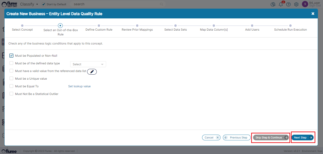 In this step, the user needs to choose whether they want to create any OOB rule in the workflow. It is important to note that choosing an OOB rule does NOT mean that the user can’t create a custom rule as well. A user can create both in the same workflow which means that at the end of the process, you could have created two or even three rules together on the same concept – one or more OOB rules and 1 custom rule.