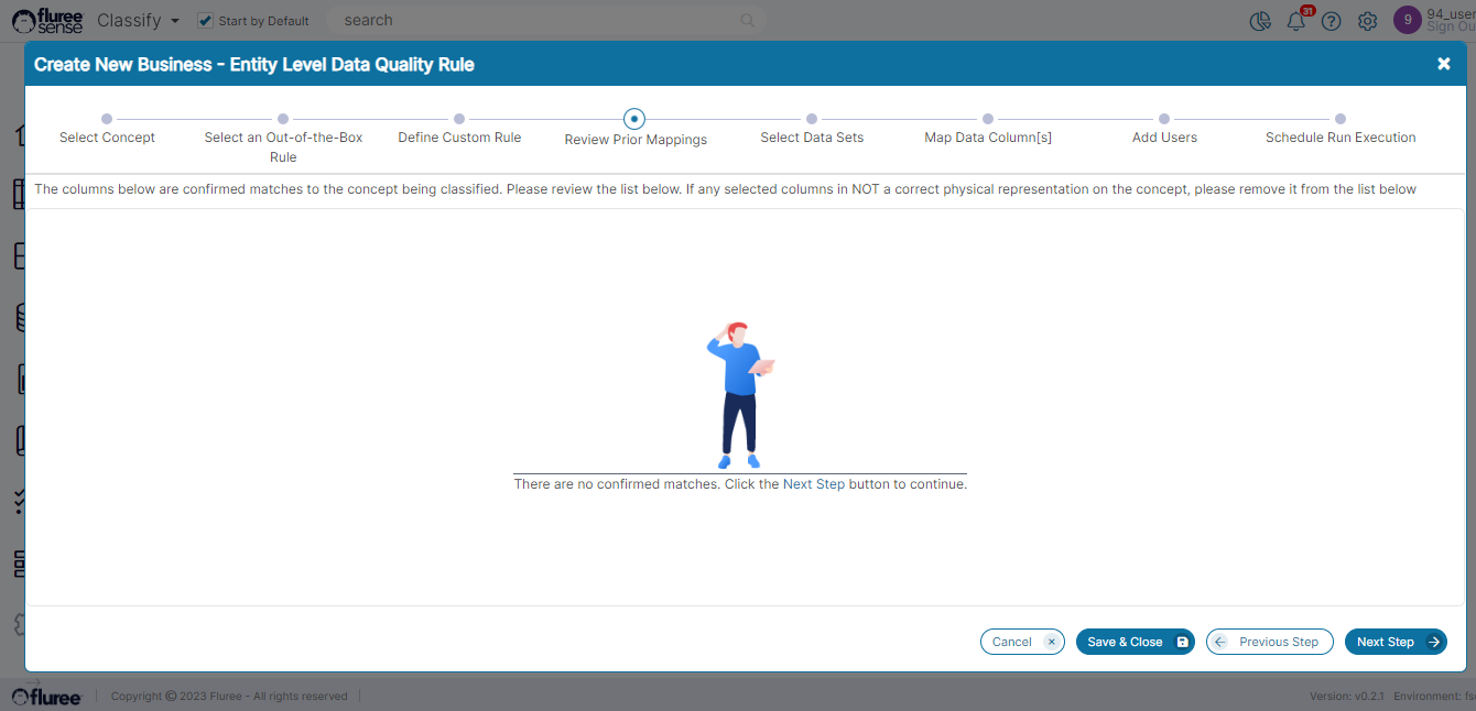 Since this is a rule on one or more Concept(s) – across exceptions, if there are any prior high confidence mappings on these Concepts , they will get shown here. The user can remove any false or unnecessary mapping(s) here. However, if there are no prior mappings, as is the case below, the user should just move on to the ‘Next Step’.