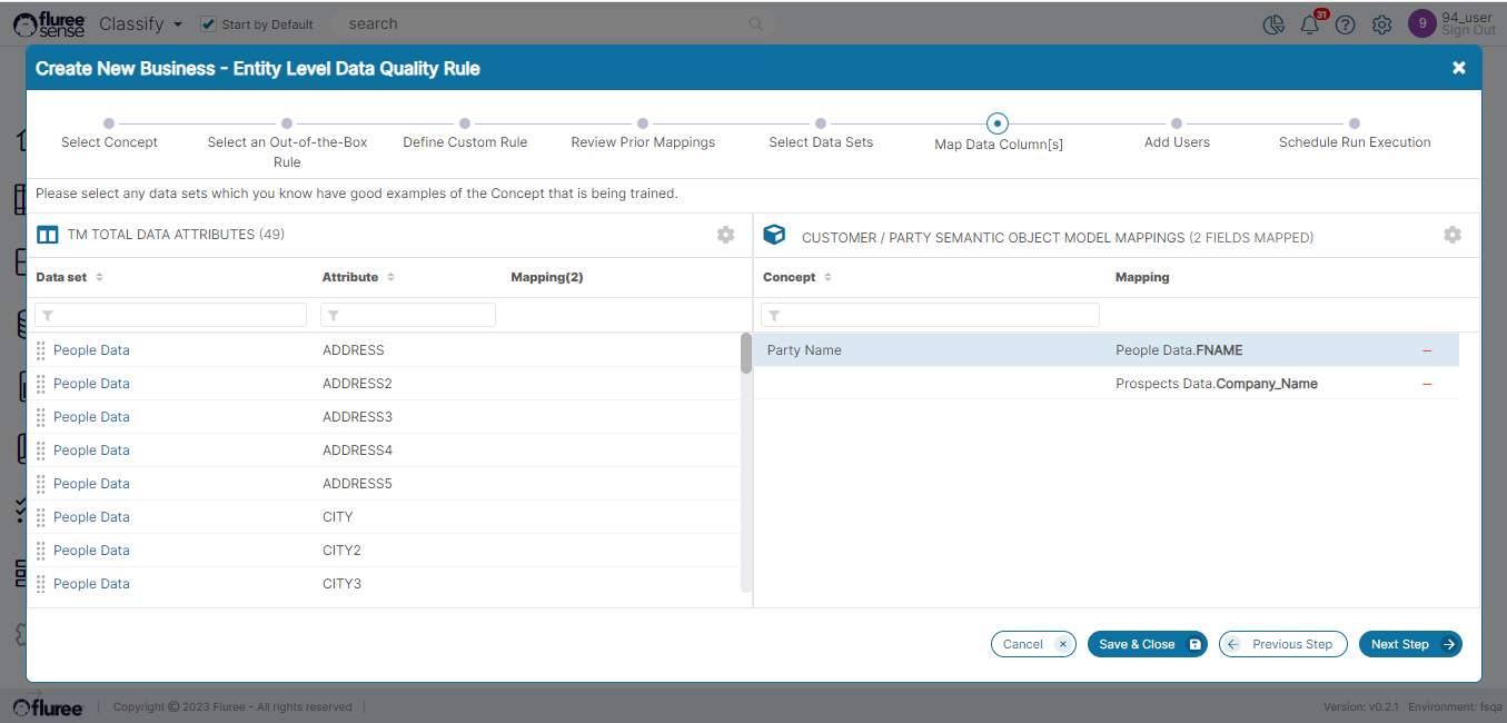 Based on the Data Set(s) selected in the earlier step, Data Columns get listed on the left side for all those Data Sets. On the right side, the Concepts related to the exceptions in the Custom Rule Definition screen are listed. The objective here is to allow users to map columns to the Data Set through drag and drop operation as can be seen here.