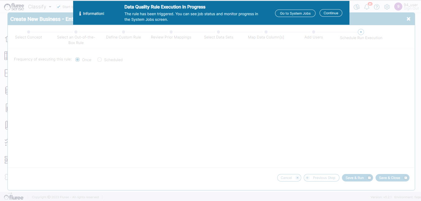 In this case, assume that the user chooses to Run the Rule just once and immediately. Hence, he or she keeps the default ‘Once’ option selected and just presses the ‘Save & Run’ button.