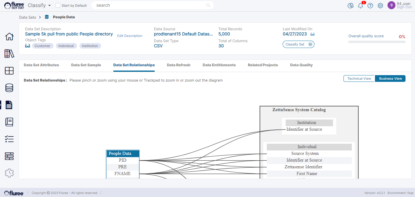 If the Data Set has been Classified at least once, then the user will see a Relationship Diagram of relations between that Data Set’s Columns and different Concepts across the Semantic Objects of the System in the Business View. The user can also see column-to-column relationships in the ‘Technical View’.