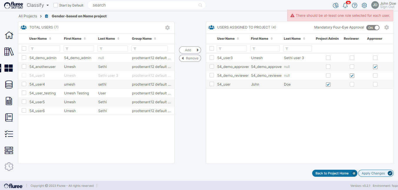 We’ve already seen the Data Screens, such as the Training and the Project Data screens. So, we will not repeat that. But in the case of Managing Project users, let's look at the scenario of adding a new user without specifying the entitlement and pressing “Apply Changes.”