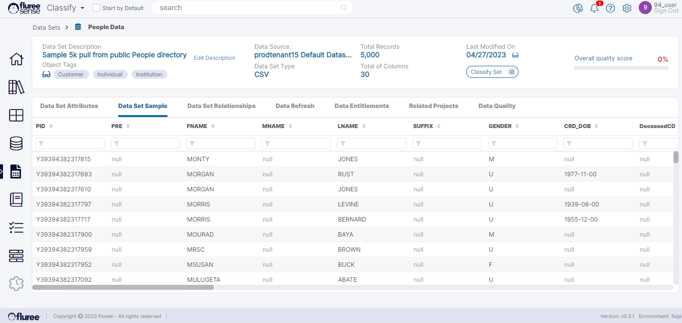 By clicking on the Data Set Sample tab, the user is taken to a screen where a sample of all the columns of the Data Set is shown. Note that Data Set Columns tagged as PII, (Personally Identifiable Information) will be masked. Columns are tagged PII not directly but by their concepts in Catalog which we’ll talk about in another section.