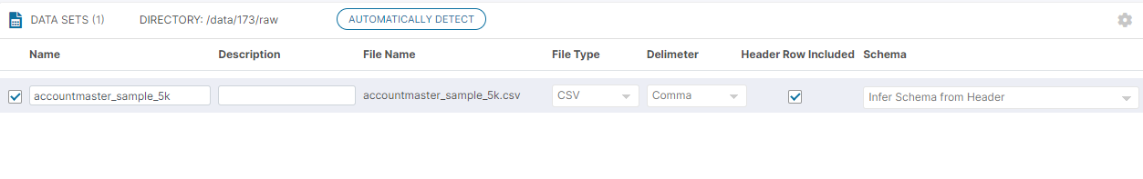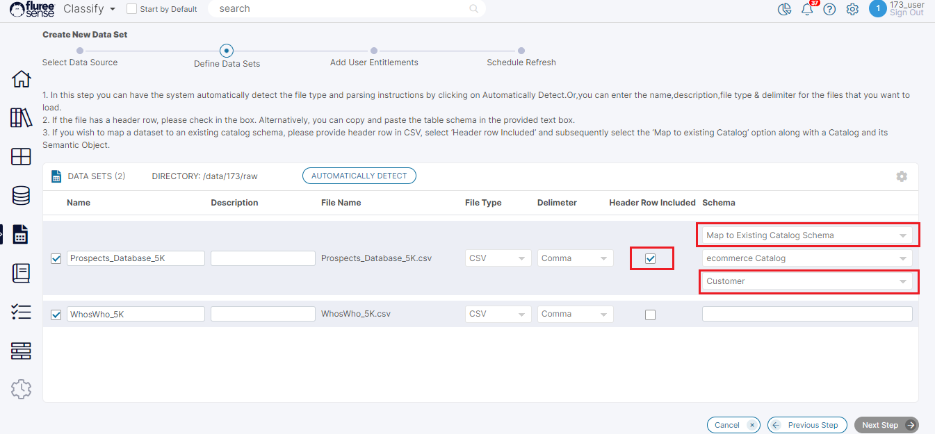 Here the user would also need to choose the Catalog and Semantic Object name where the matching column names are supposed to exists. However, other Data Sets may still use the standard Classification where the drop-down would default to : "Infer Schema from Header" as shown in the image below.