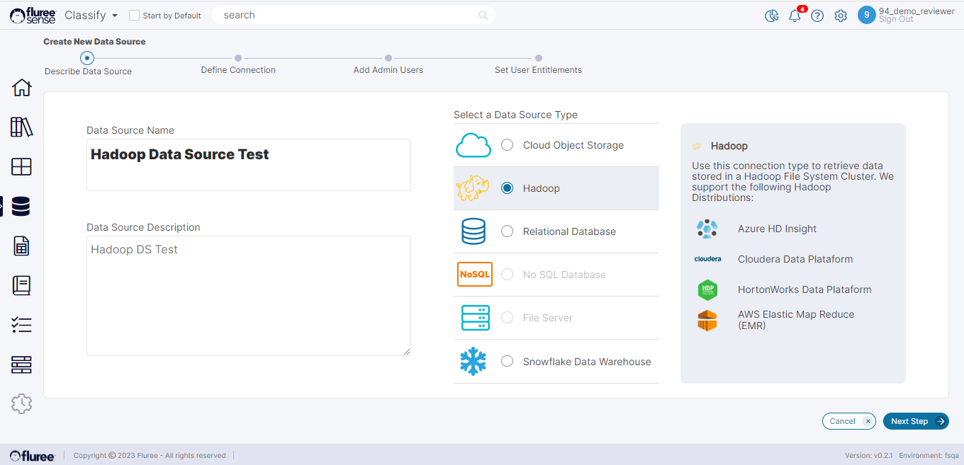 Creating a new Data Source connection begins with choosing the Data Source Type and some other details as shown in the screen below. You can have multiple Data Sources feeding into the Classify product. This also requires entering the: