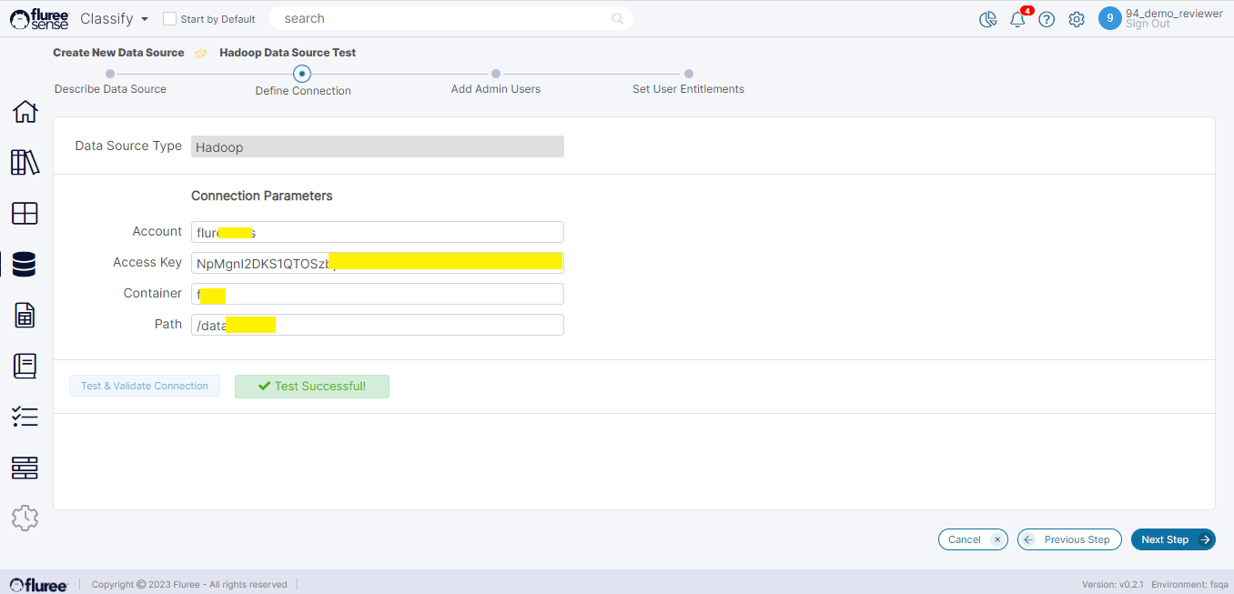 On clicking the Next button, the user can enter the connection details which will depend on the Data Source type chosen in the previous screen. To move ahead, the user needs to add the connection parameters and click on the ‘Test and Validate’ button to make sure that the connection-string is valid.