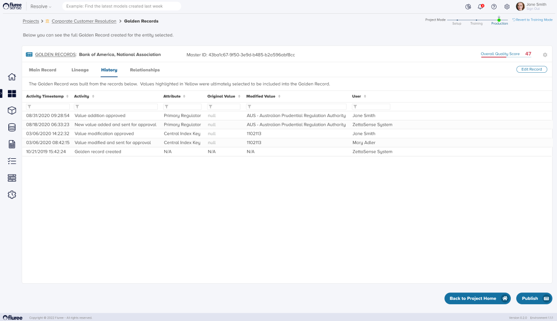 As you can see, the latest change will show up on top, and the changes can be filtered or sorted. A history record gets generated whether the Golden Record changes through a manual edit or project run.