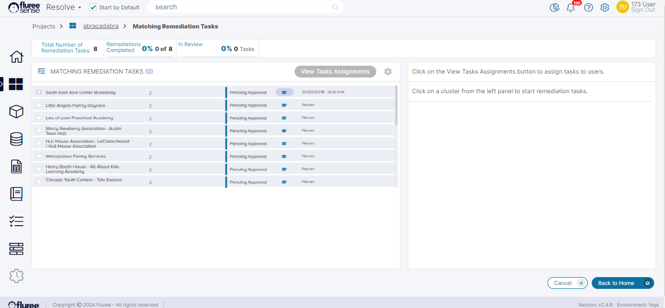 Below is a typical list of Fixing (or 'Matching Remediation' Tasks as they are called). These are accessible from the wrench icon in the Project Home Screen in the left side , in the 'Entities Resolved' section.