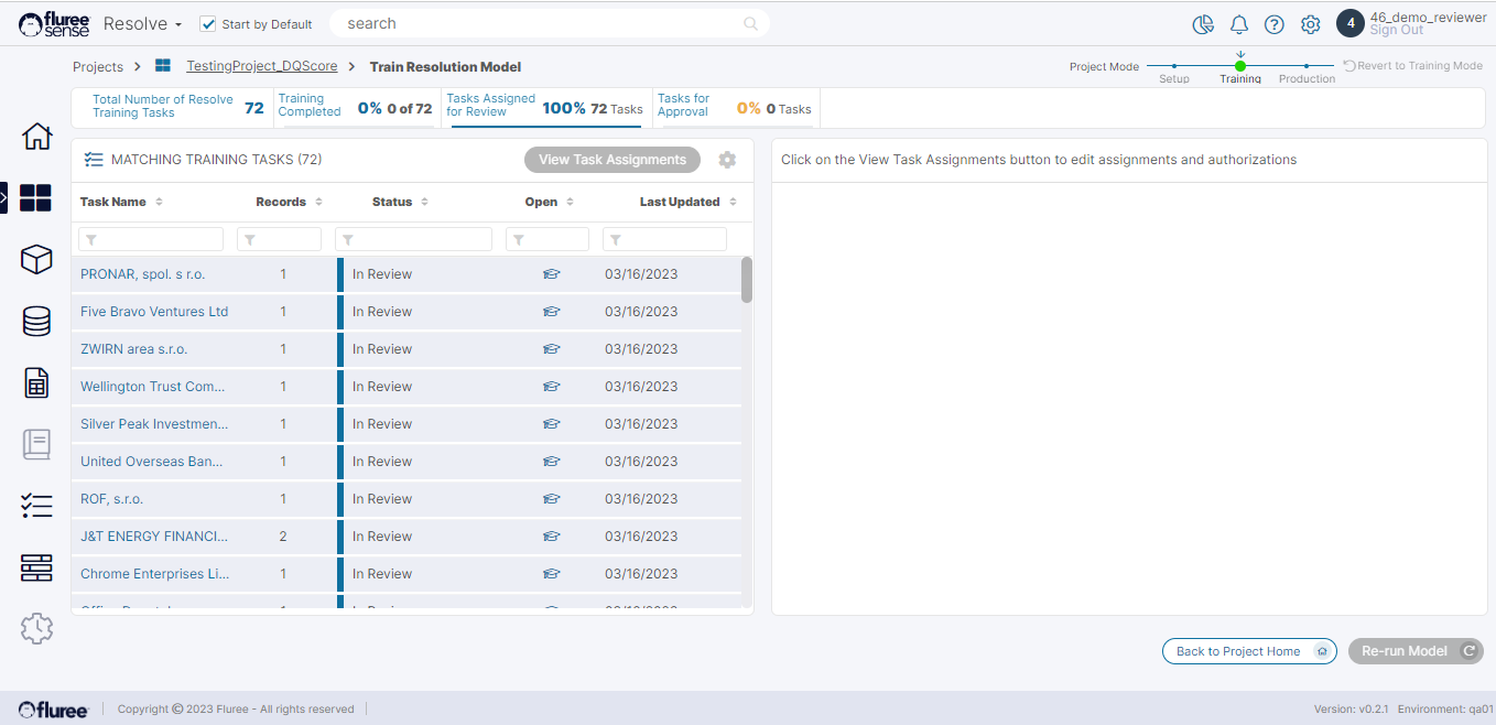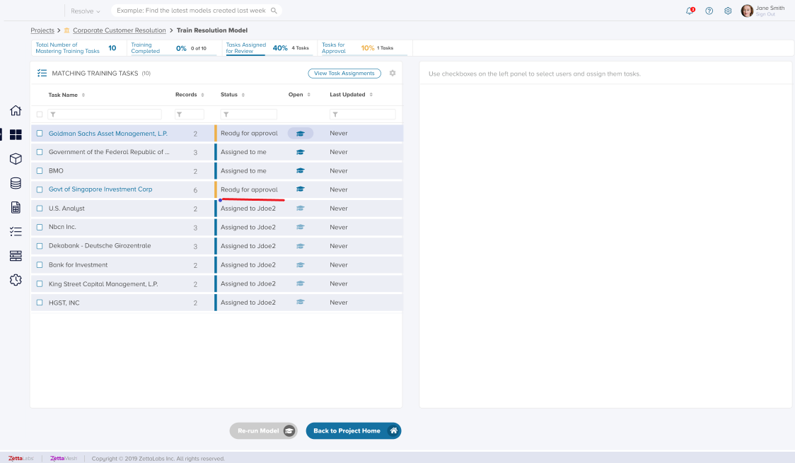 Once all the training tasks are in the "Completed" state, the "Re-run Model" button is activated. Only users with the Project Admin role can re-run the model to trigger the "Supervised Learning" model, which generalizes the feedback from various training cases into knowledge that the System further uses to improve its matching confidence.