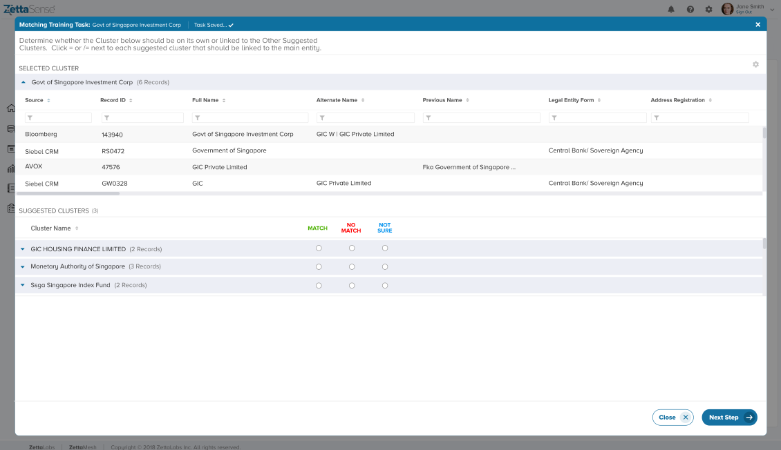 Auto-Save is a new feature for Matching Tasks (in Entities Resolved section) which is going live from Release 2.3 . As we have seen above, a Matching Task has a workflow which may span up to 3 steps / screens. The first to include similar clusters to the cluster being reviewed, the 2nd to review the individual elements of the cluster itself and the third being to allocated the unmatched elements of the cluster to other clusters. Auto Save works for the first and the 2nd step which essentially means that you may make your 'Match' , 'No Match' etc. choices without pressing the 'Finish' button and the same shall be available for you to complete even if you browse away from this screen or log-out. This is helpful if the user is not sure about particular record(s) in a cluster, wants to consult or come back to the task to complete later without losing their work. This applies to any user with the requisite rights on this screen.