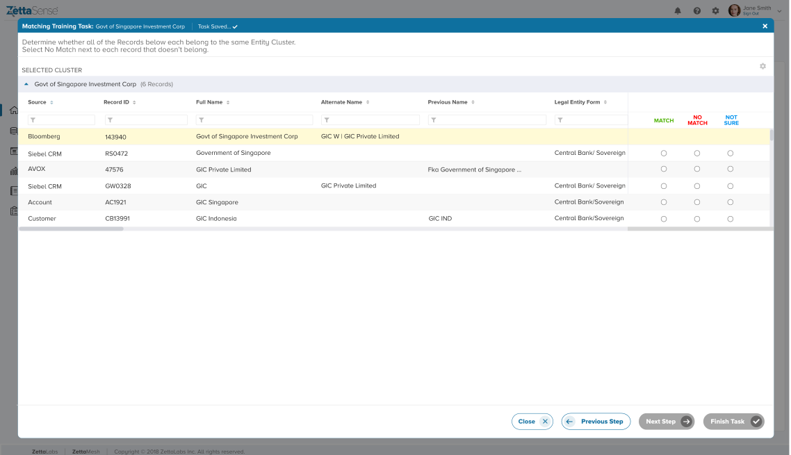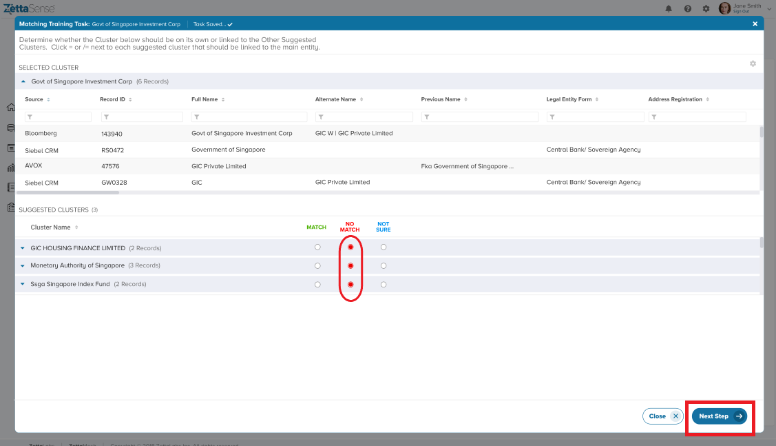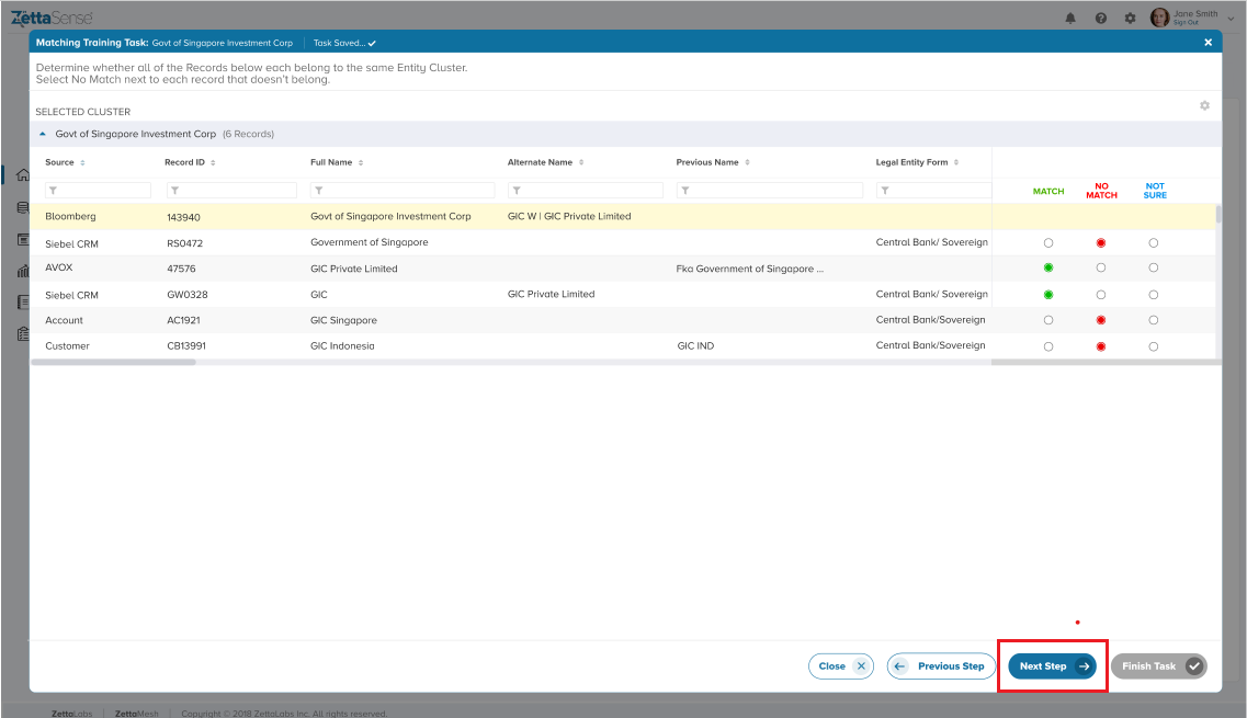 If all the records belong together (i.e., they all Match), the task gets finished, and the "Finish Task" button is activated. However, if the user selects the ‘No Match’ radio button for any of the records, the "Next Step" button is activated, and we move to Step 3.