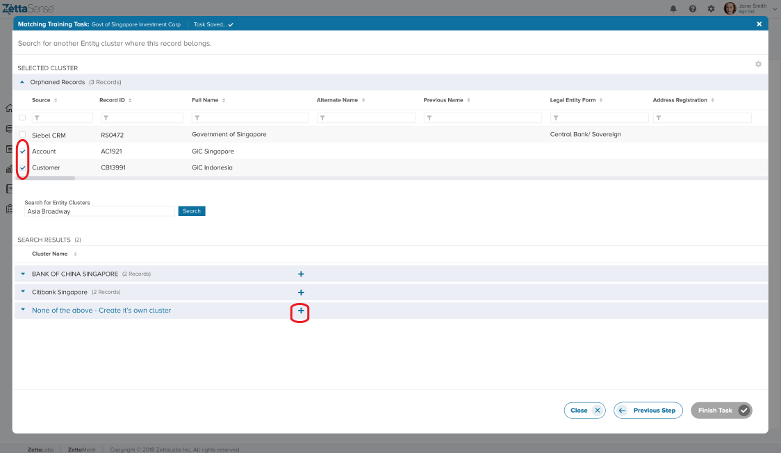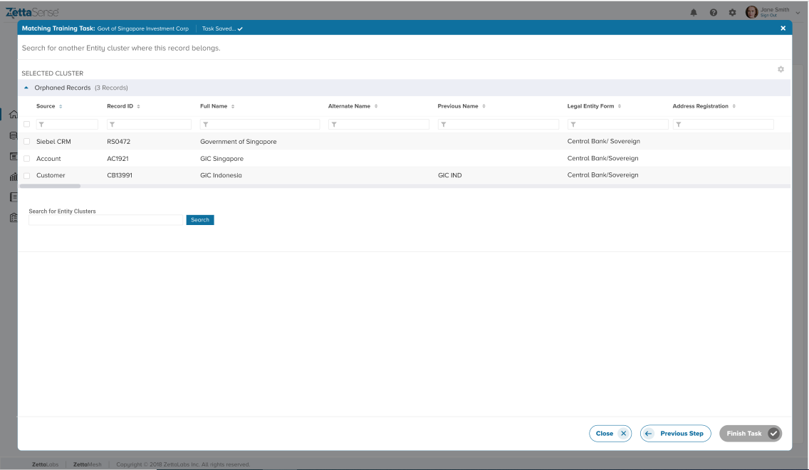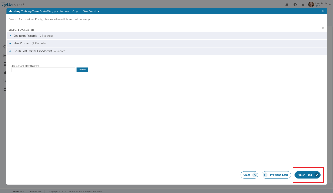 Once all Orphaned Records are linked to one or the other cluster, the "Finish Task" button is activated, denoting the completion of the task.