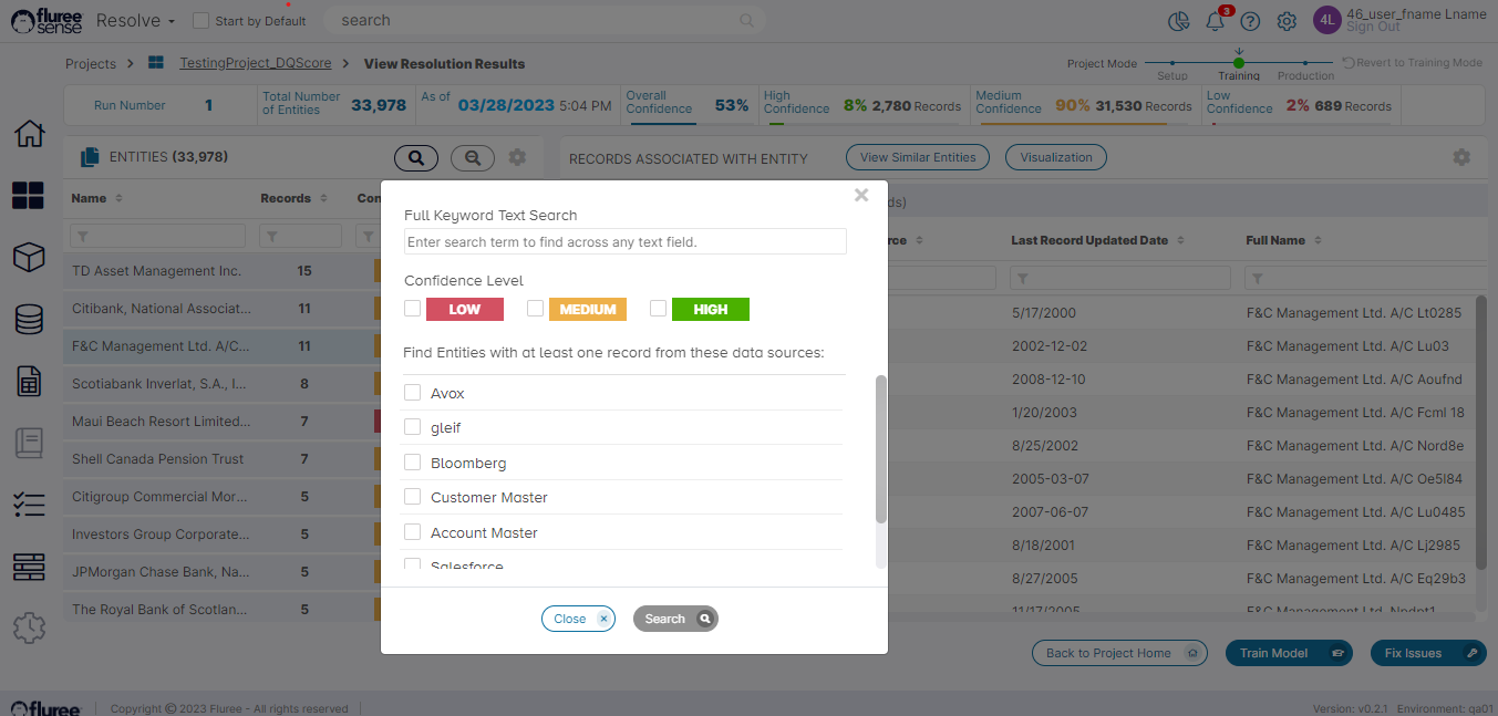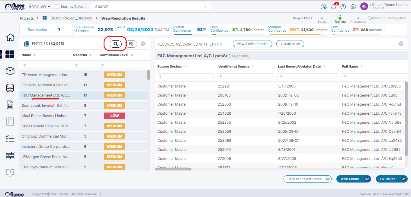 Clicking the name of any Entity on the left-hand panel will show rows of the records matched together for that entity, appearing in the right panel. From here, one can scroll through and visually see all the records linked together. Alternatively, one can click "Train the Model" or manually "Fix Issues" buttons on the lower right.