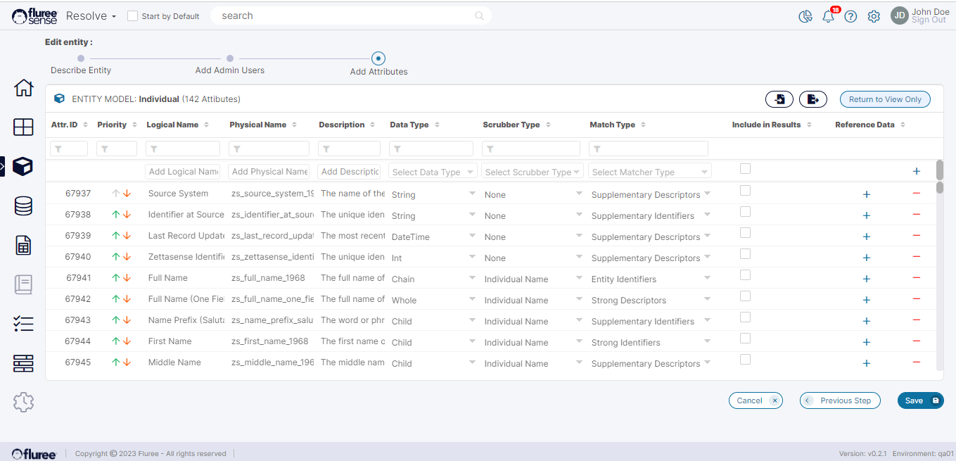 You can follow the workflow as shown above till the beginning of the third step. Once you reach the third step (by clicking the ‘Next Step’ button), you will be in the ‘Add Attributes’ tab. Initially, the screen loads displaying the attributes. On the upper right-hand side of the screen, you will see a button labeled ‘Edit Entity Mode’. Clicking on it will refresh the system and you will now be able to see the attributes in edit mode. You can edit the attributes and click the ‘Save’ button when done. While you are in the edit mode, you will see that the upper button on the screen has toggled to ‘Return To View Only’. Clicking this button will take you to the initial view-only Entity Attributes screen.