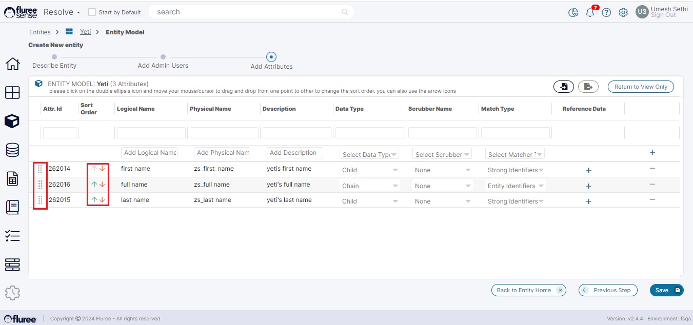 To move the attributes up or down, we always had the arrow keys (green to move up, red to move down) . However, if moving across multiple rows, this becomes cumbersome. In this situation you can use the drag and drop option by selecting the double ellipse in the left corner of that row and moving across. Please note it may take up to a second or so, for the result to reflect on the screen in case of large record sets. This drag and drop option is available for Entity Attributes in both Create and Edit flow and shall be available with the 2.4.4 release.